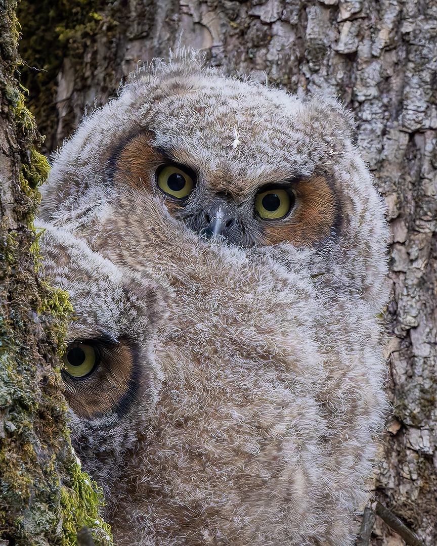 This pair of Great Horned Owlets were looking out from their nest playing “Peek-a-Hoo” at Willamette Park in Corvallis, Oregon.