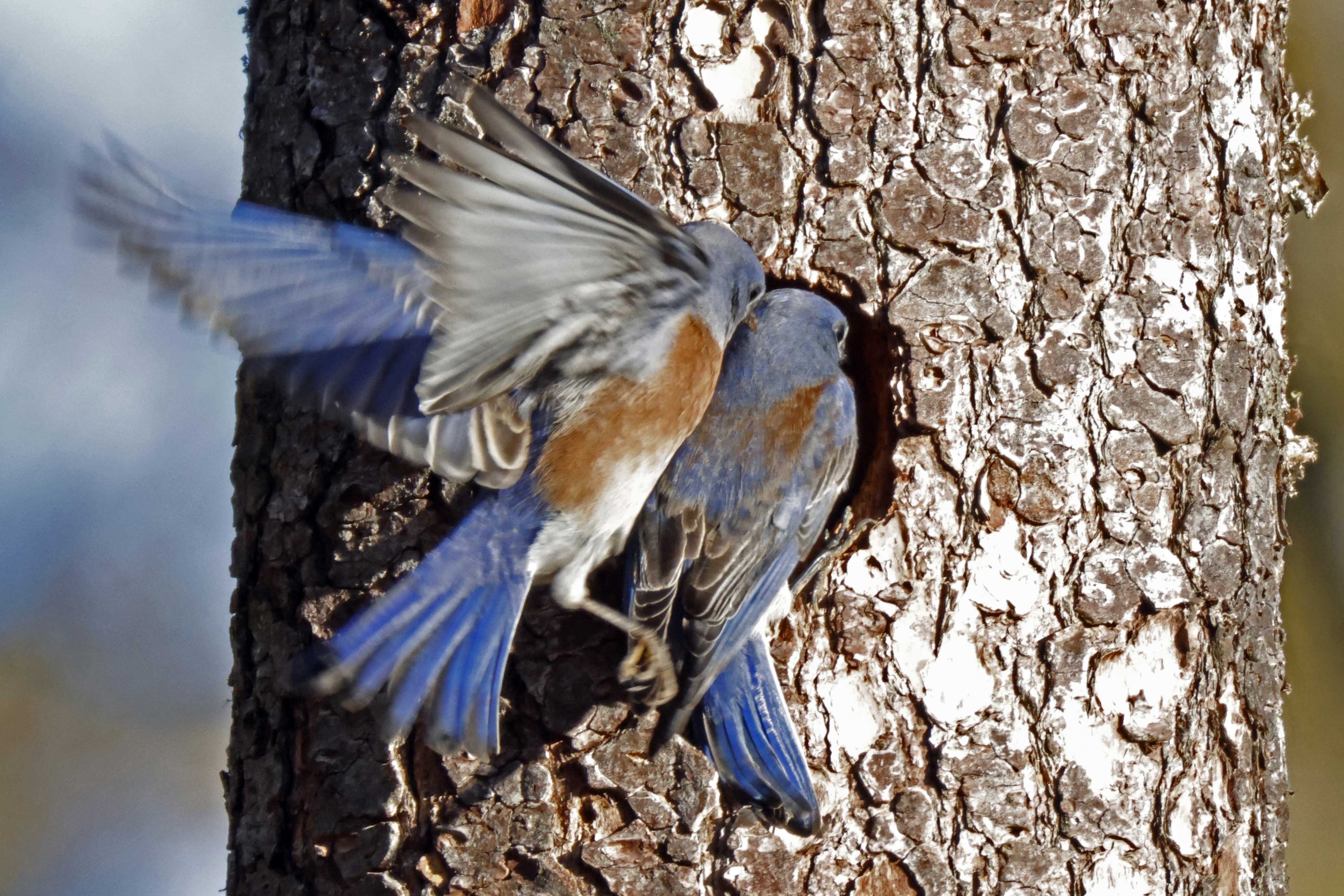 Western Bluebirds investigating an abandoned Hairy Woodpecker Nesting Cavity.